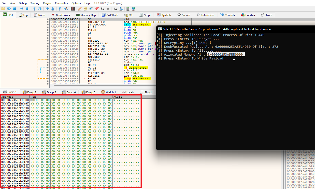 The next step is to check that memory is being allocated using the VirtualAlloc Windows API. Again, looking at the memory map at the bottom left it shows that memory is allocated and was populated with zeroes.